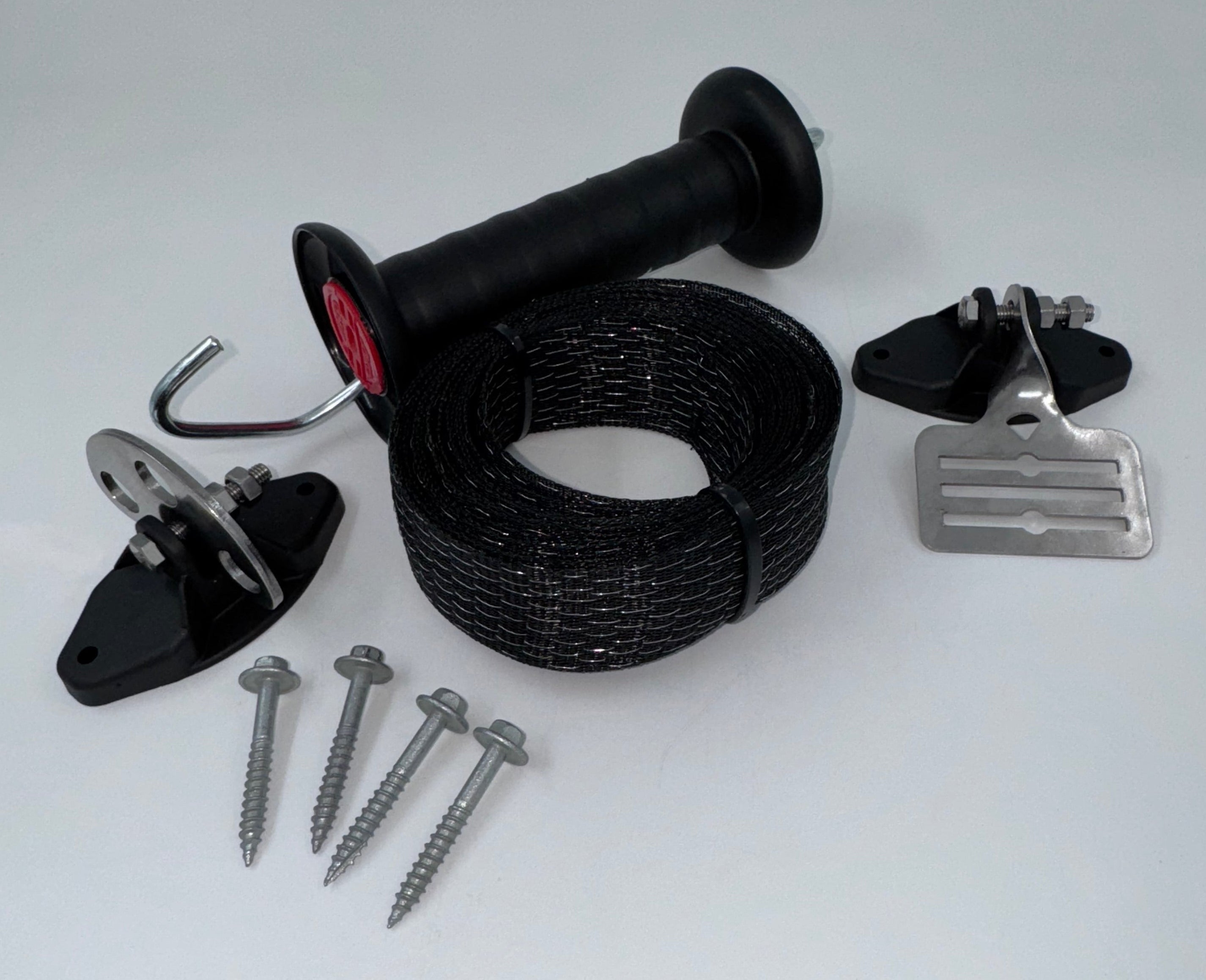 This complete kit includes everything needed for quick and easy installation, including stainless steel connection buckles, pinlock connectors with power attachments, and a spring-loaded gate handle in your choice of colours. Built tough for New Zealand’s farming environment, the system eliminates the need for crimp connectors or knots and can be easily upgraded to bungy cord if needed in the future.