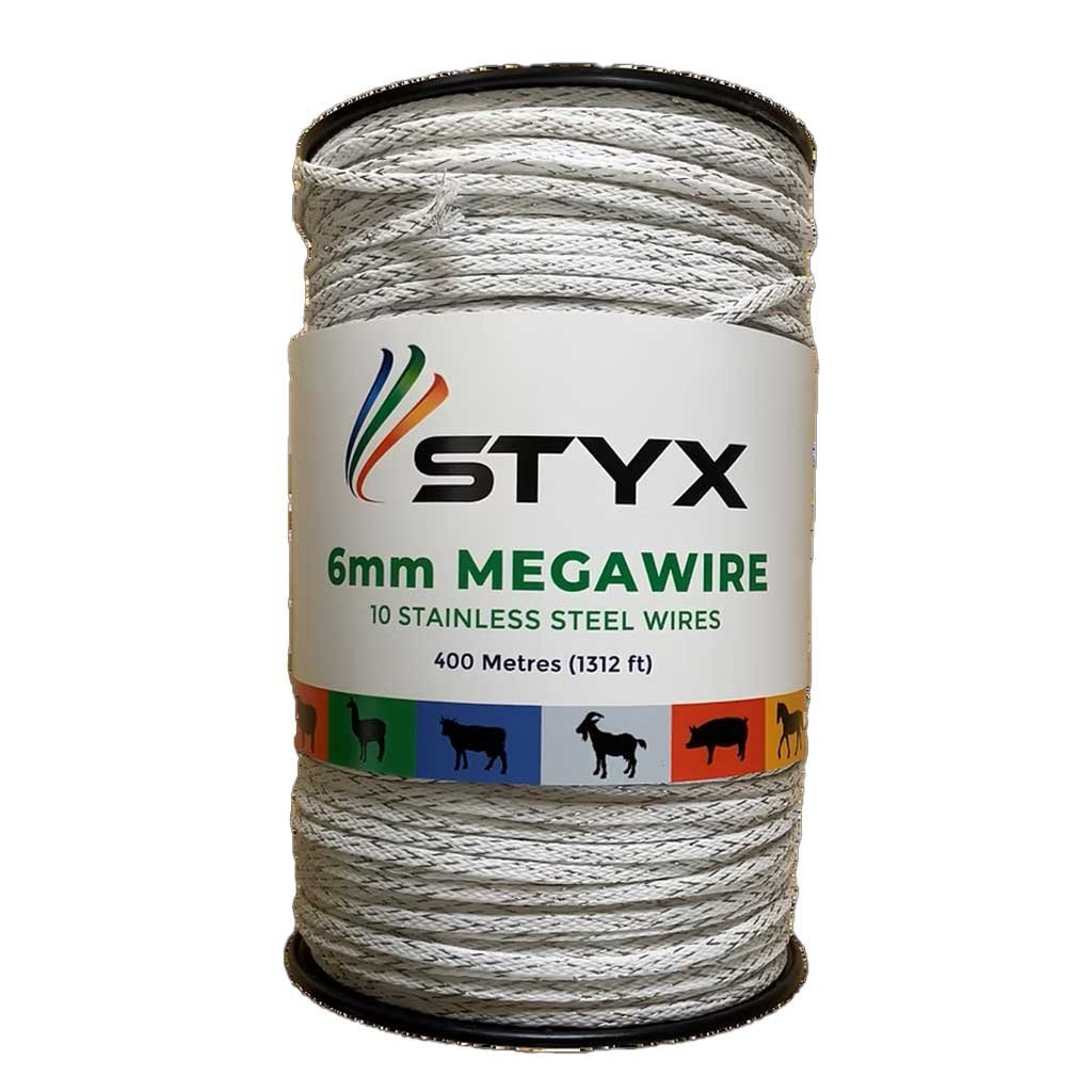 Styx Mega wire is a premium electric fencing solution designed for high visibility and extreme durability. This 6mm braided electric wire features a tubular braid design that provides double thickness for added strength and wear resistance—making it ideal for demanding livestock environments, especially horses.