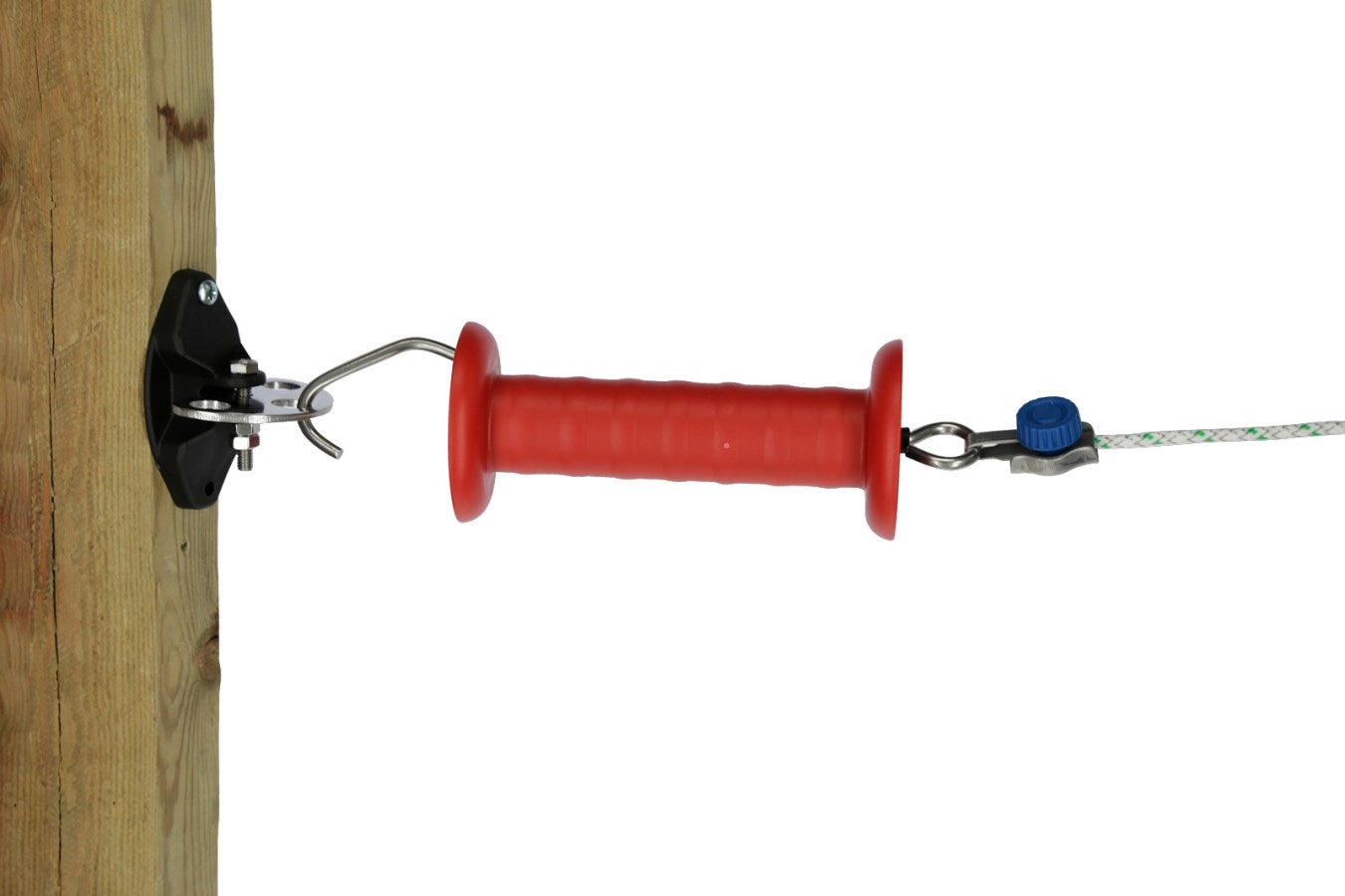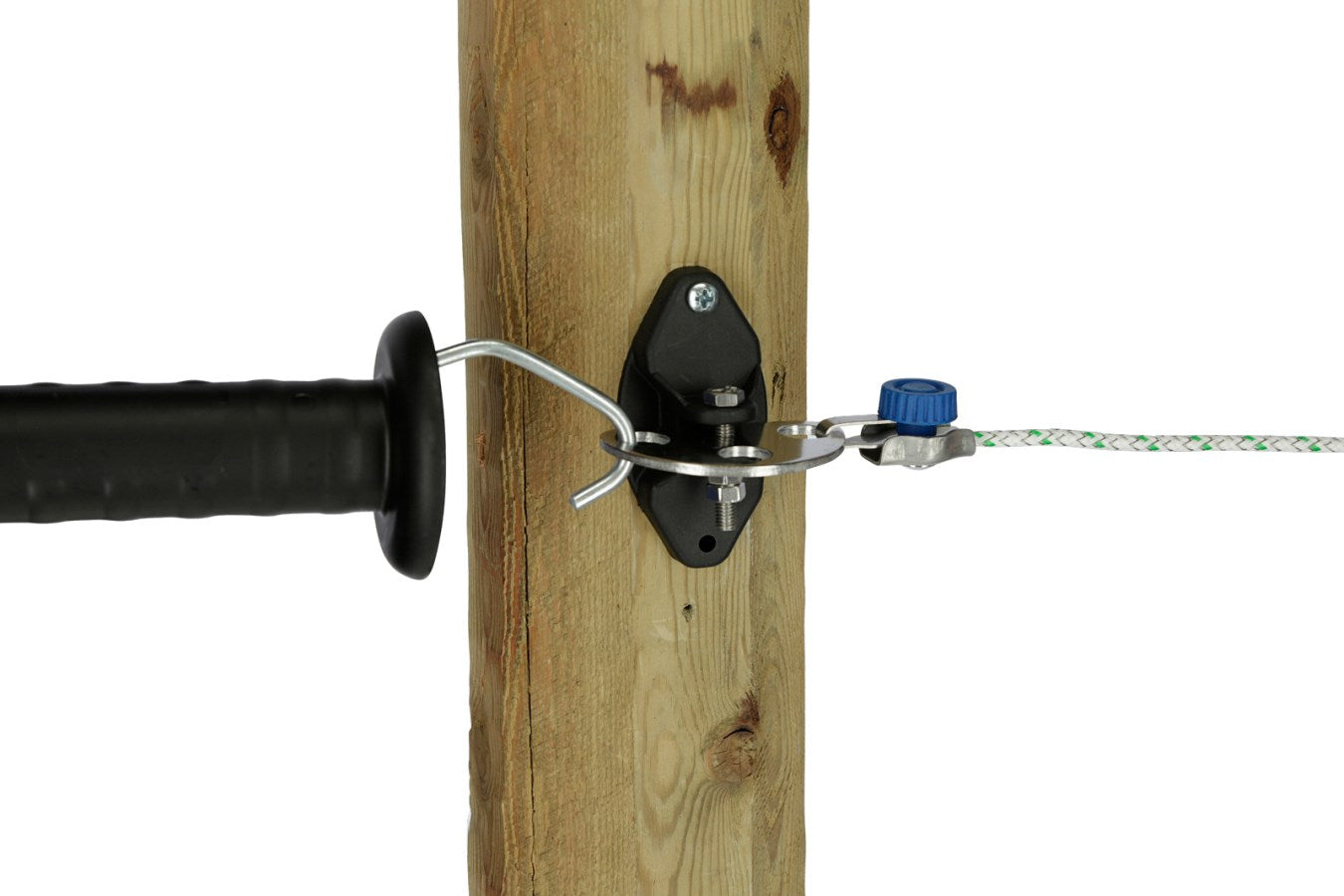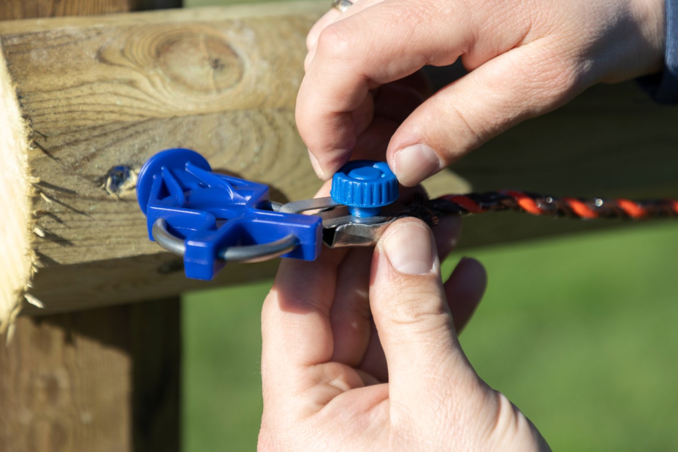 Simply thread your polywire or rope into the connector and tighten using the blue clamp – no tools required. This system offers a quick and secure connection to gateway insulators, gate handles, or the screw-in gate insulator model 446550, making it ideal for flexible fencing setups or frequent adjustments.