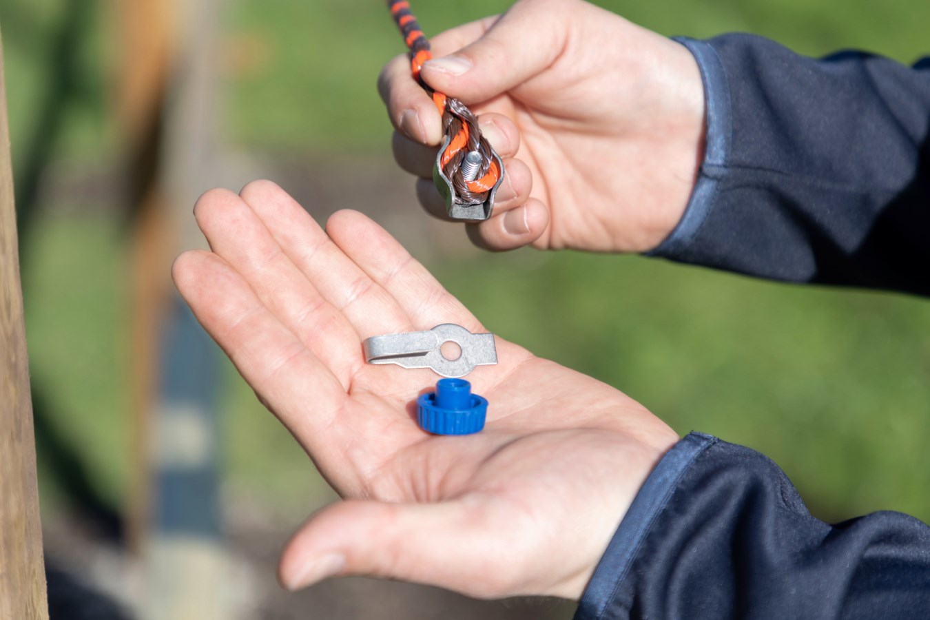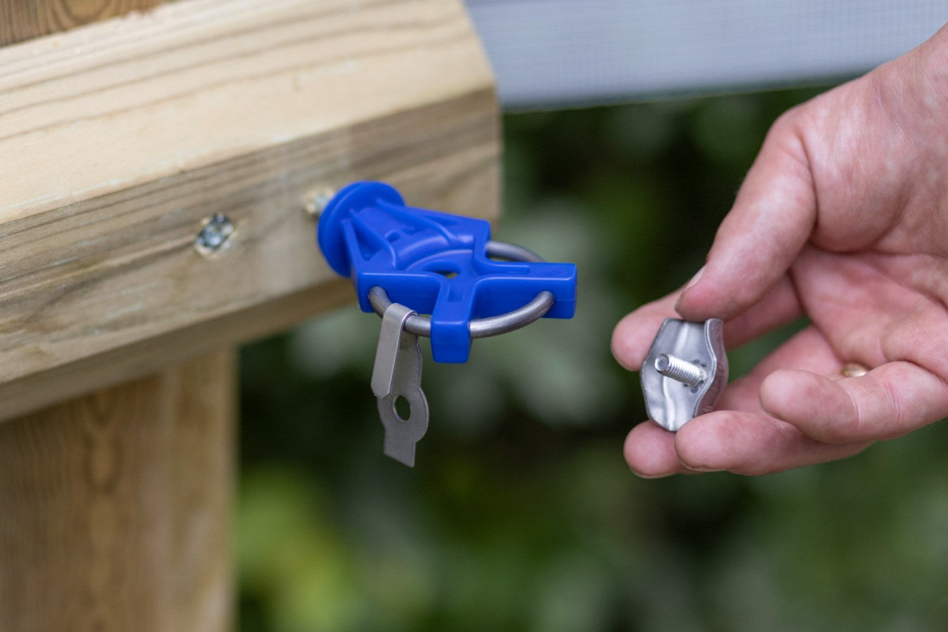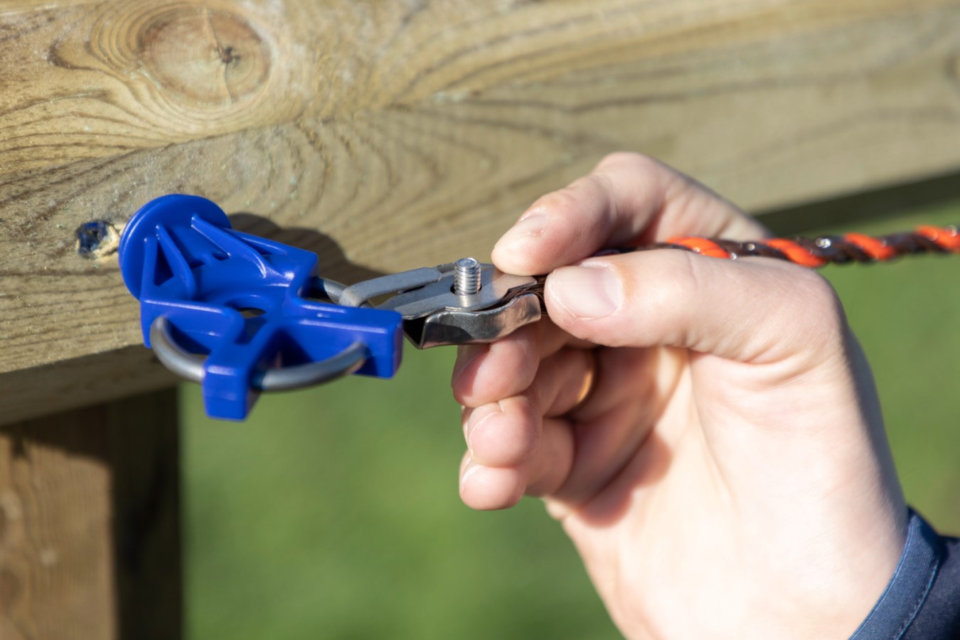 Simply thread your polywire or rope into the connector and tighten using the blue clamp – no tools required. This system offers a quick and secure connection to gateway insulators, gate handles, or the screw-in gate insulator model 446550, making it ideal for flexible fencing setups or frequent adjustments.